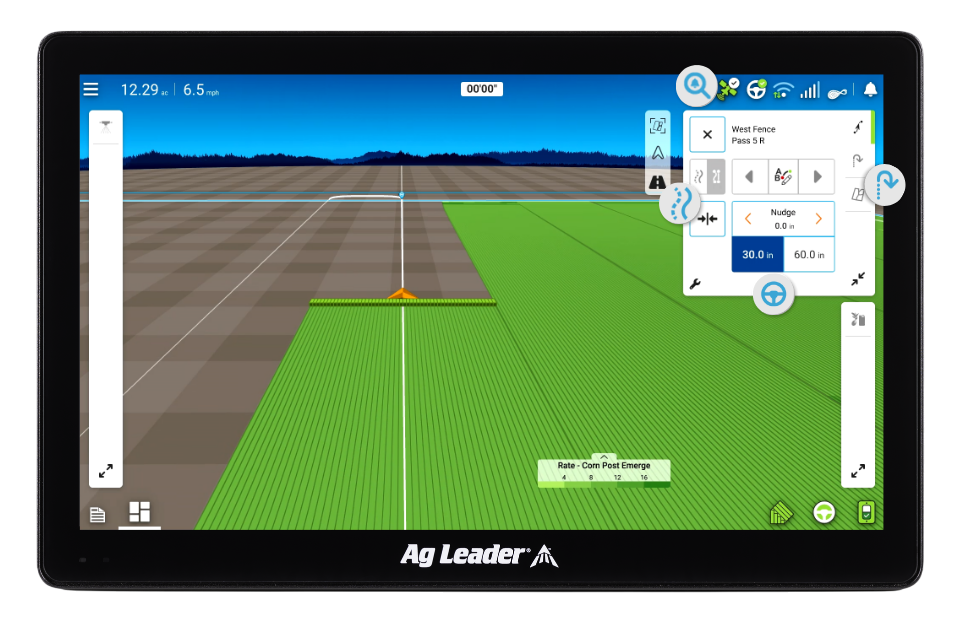 Tus controles de dirección, el ícono del vehículo y la línea de guía siempre son visibles en cualquier vista elegida sin perder de vista la pantalla del mapa y la información de la operación del campo.